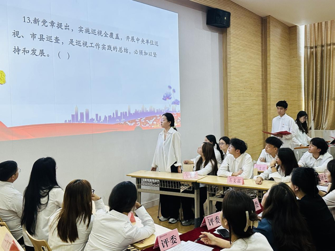 通过前期各个支部党员的党史校史知识学习、测试和选拔,最终八个支部各两名成员组成团队进入决赛。竞赛内容涵盖了党章、党纪处分条例、党风廉政建设和学校发展历程、校园文化等相关知识。比赛分为选择题、判断题、填空题和抢答题,四个环节。