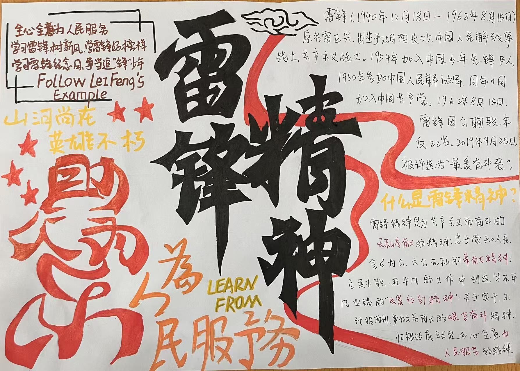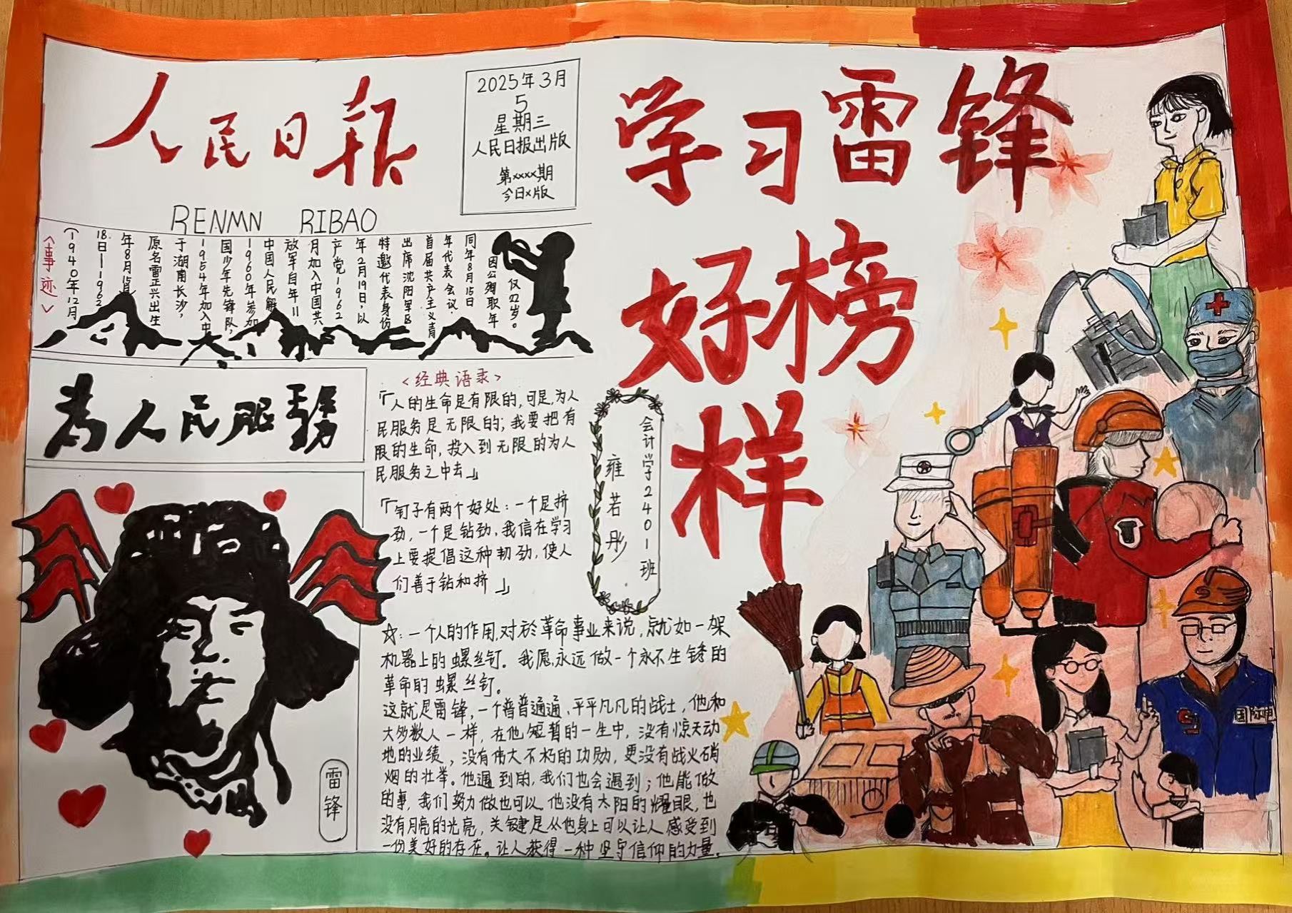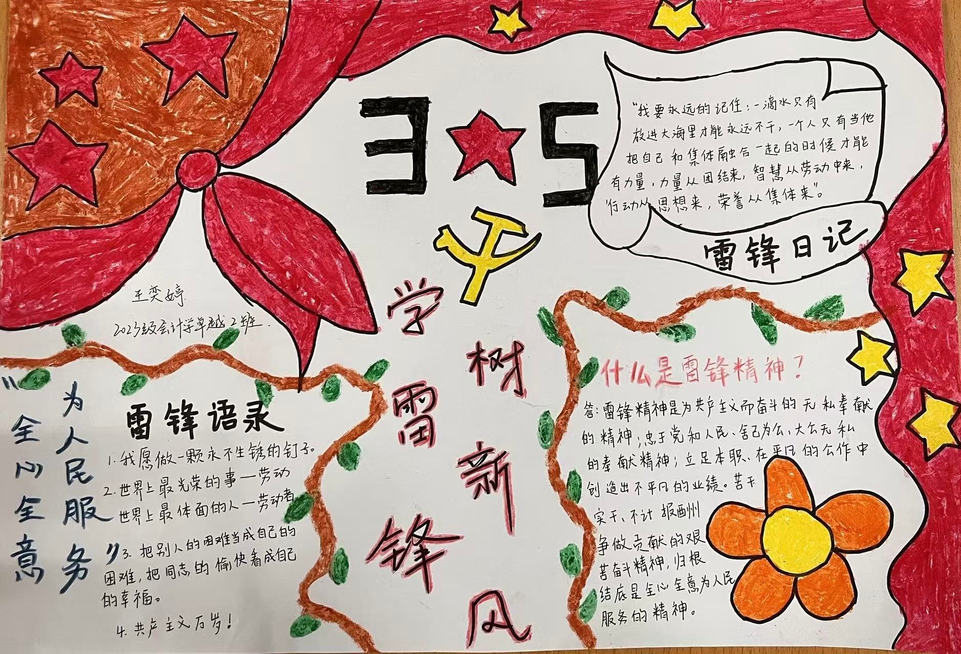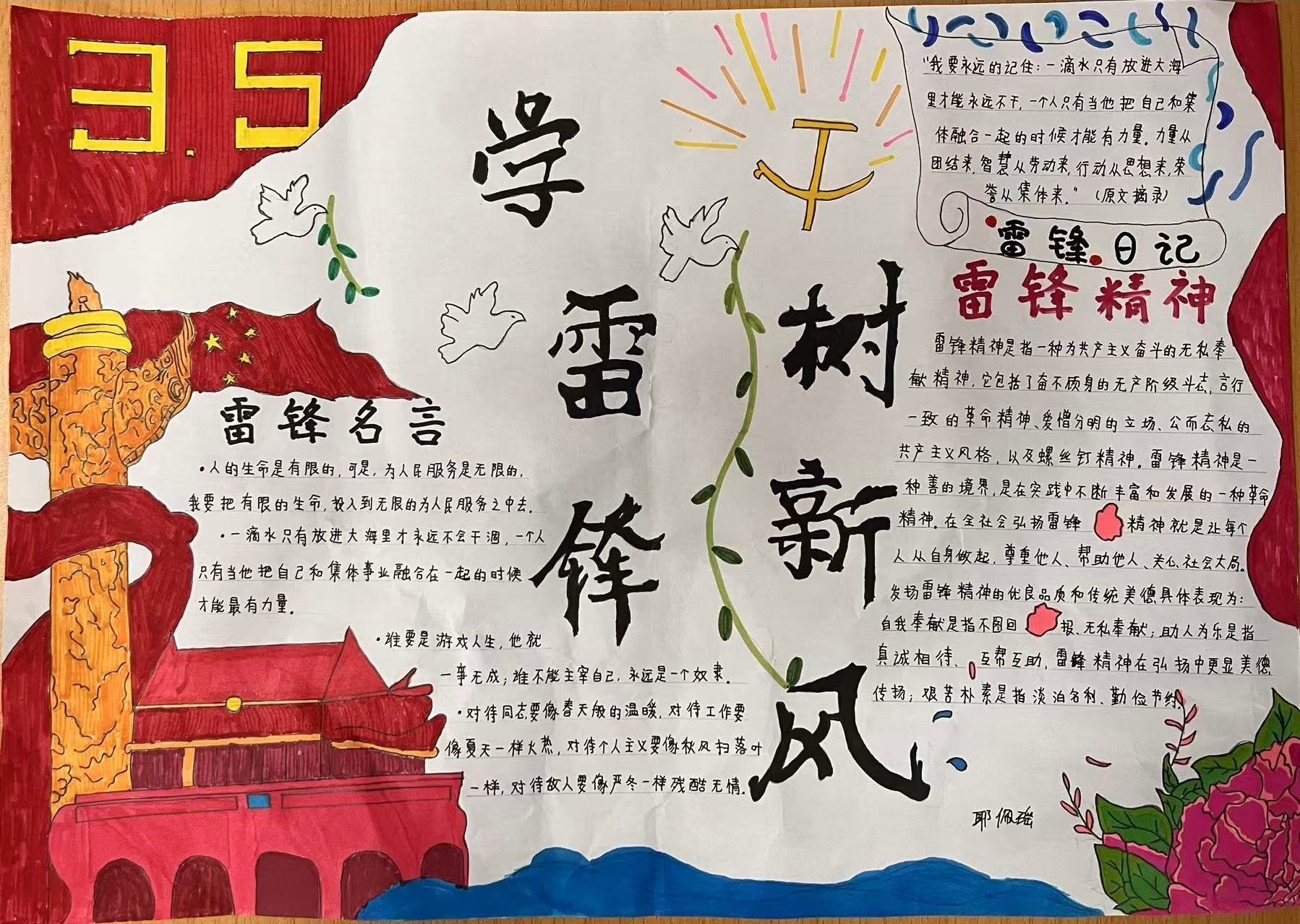 活动期间,大家在一张张手抄报上描绘出对雷锋精神的理解与感悟。有的同学通过生动的插画展现雷锋做好事的场景,有的则用工整的文字阐述雷锋精神的内涵,还有的分享了身边的雷锋式人物事迹。这些手抄报内容丰富、形式多样,不仅体现了同学们对雷锋精神的深刻领会,更展示了新时代青年积极向上的精神风貌