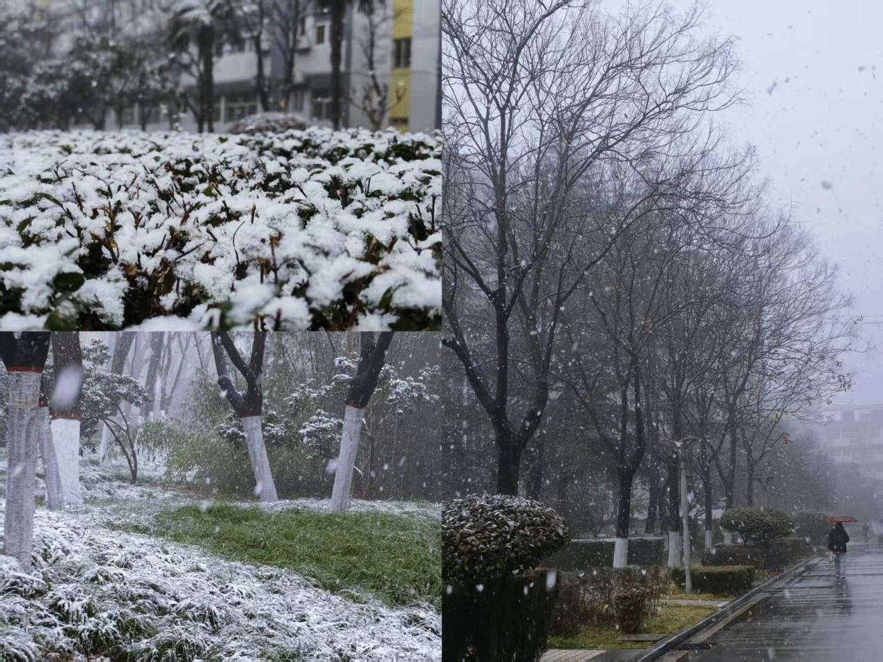 落雪的行道树旁,撑着五颜六色的伞的同学,慢慢走过,脚印在湿润的路面上,浅浅印下又很快消融,修剪整齐的灌木丛,裹着一层雪绒,像缀满了碎银的绒球,这一幕恰似古诗中,“孤舟蓑笠翁,独钓寒江雪”的清逸。