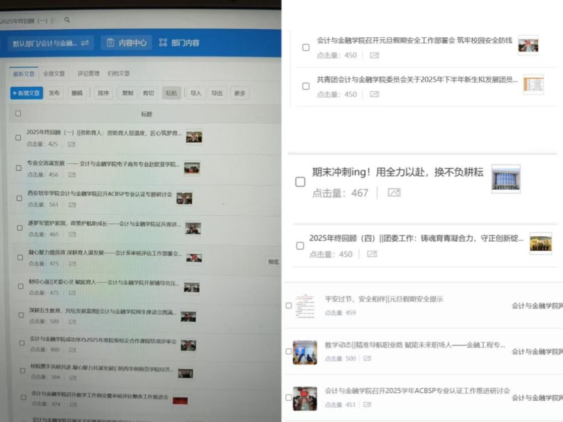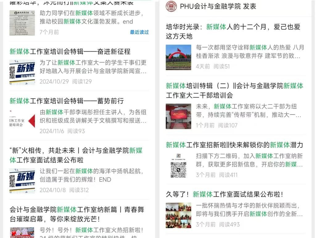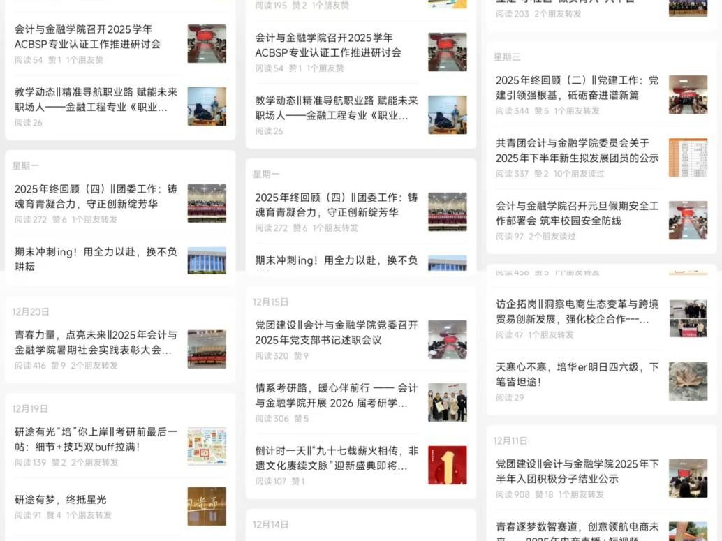 微信公众号《PHU会计与金融学院》作为院系资讯传播主阵地,全年累计发布推文846篇,内容涵盖学院动态、教学科研、党团建设等多个方面,成为师生获取信息的重要窗口。抖音、微博平台聚焦轻量化内容创作,分别发布作品39条、29条,以生动活泼的短视频、图文形式展现学院风貌,增强宣传吸引力。
