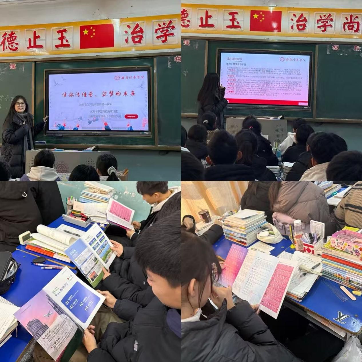 宣讲活动在高三班级拉开帷幕,团队成员王添奇同学以“我的培华成长记”为切入点,通过精心制作的PPT与校园宣传片,全方位展示西安培华学院办学底蕴、学科优势、校园文化与就业前景。从百余年办学历史的文化积淀,到现代化的教学设施与实训平台,从特色专业课程设置,到创新创业实践与奖学金政策,生动的案例与详实的数据,让学弟学妹们对大学生活充满向往。同时,成员们也分享了自己从高中到大学的成长故事,用真实经历鼓励学弟学妹们树立目标、奋勇拼搏。