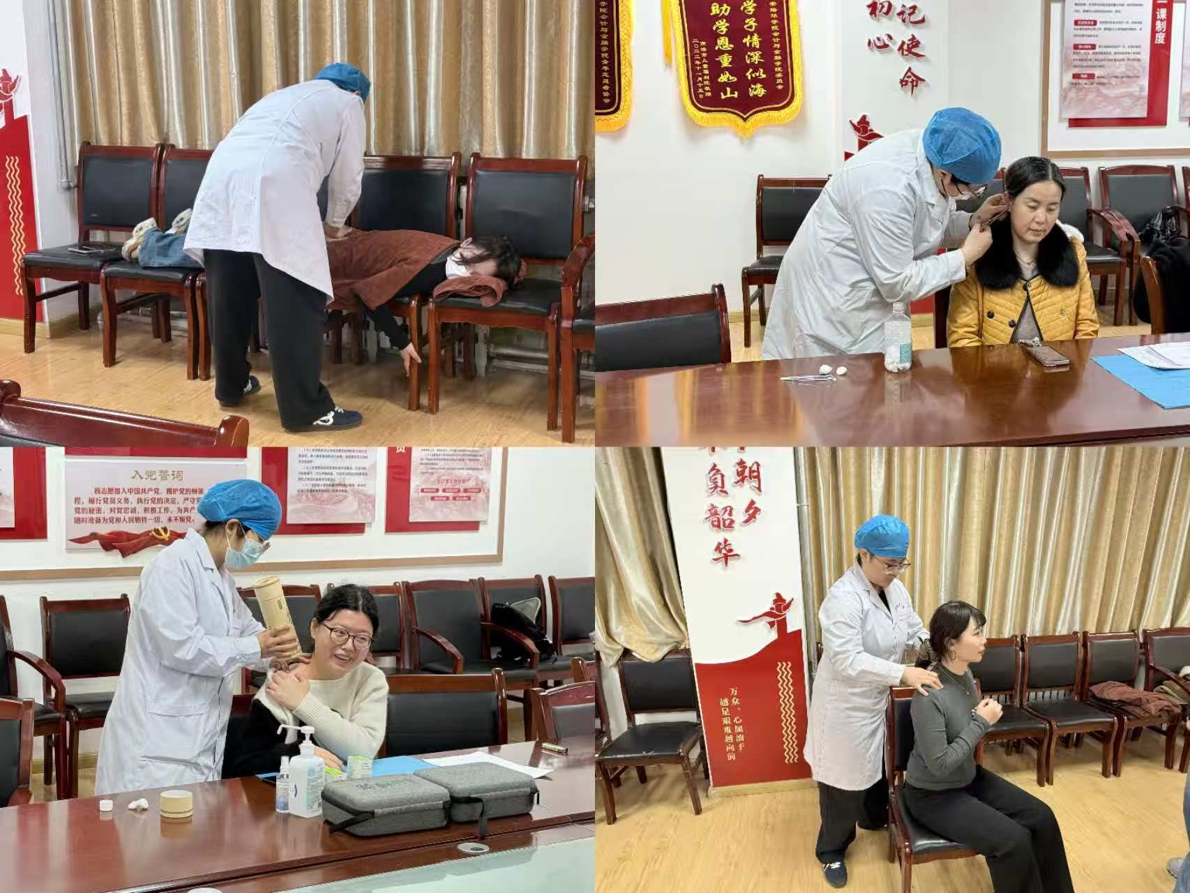 为切实关爱女性教职工身心健康,学院特邀医学院志愿者团队,开展义诊咨询、肩颈腰背专业按摩、耳穴压豆、拔罐、刮痧、艾灸等一站式健康服务,精准缓解久坐疲劳、舒缓身心压力。学院以暖心行动践行“以人为本”理念,让女教职工真切感受到关怀与重视,以更健康的状态、更饱满的热情投入工作。