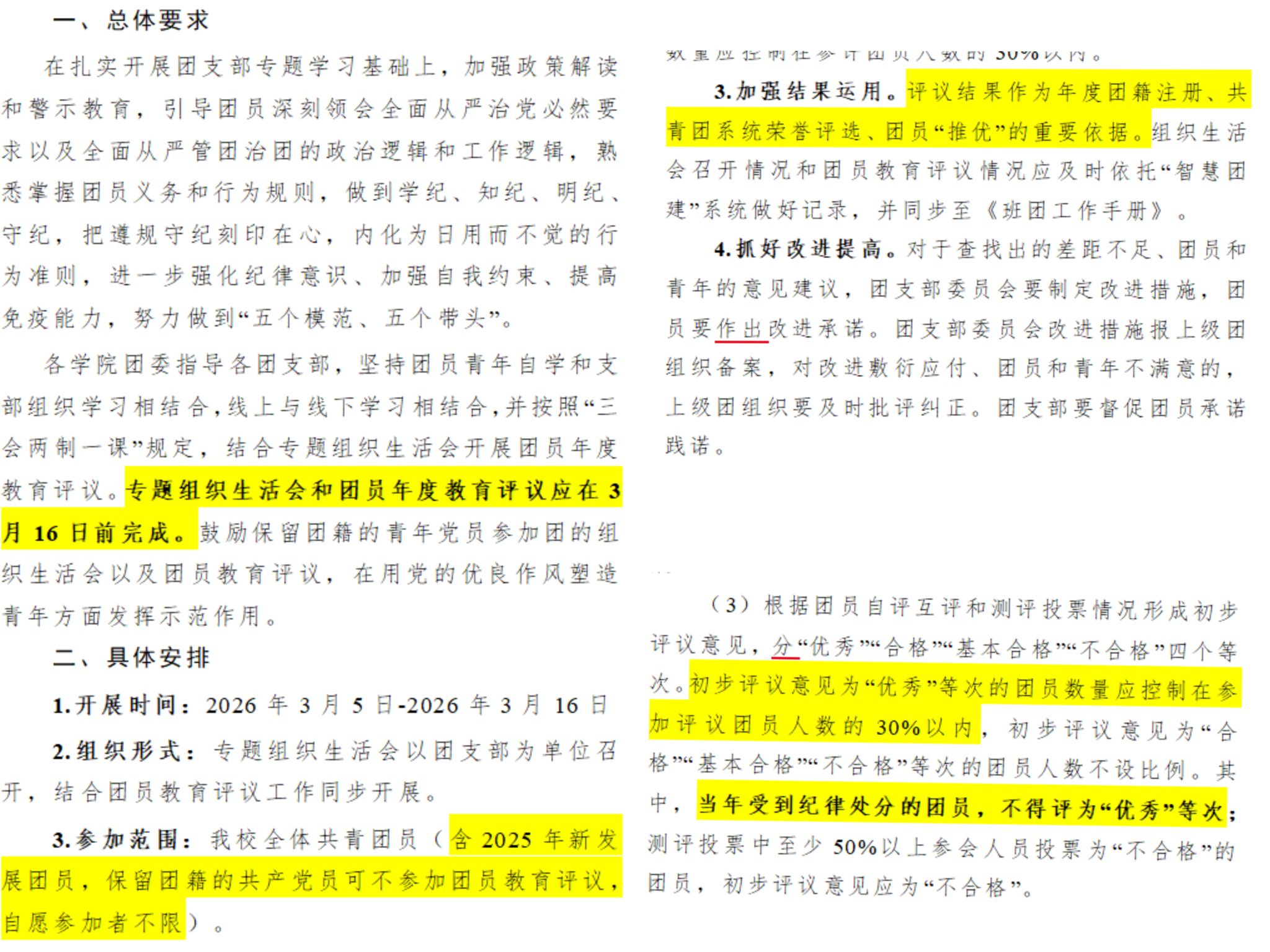 会议强调,各团支部提交的团员教育评议材料须严格统一格式。本次评议工作务必坚持公平、公正、公开原则,评议产生的优秀团员人选须在班级内进行公示,确保评议结果真实可信。在团员教育评议工作部署中,具体明确以下要求: