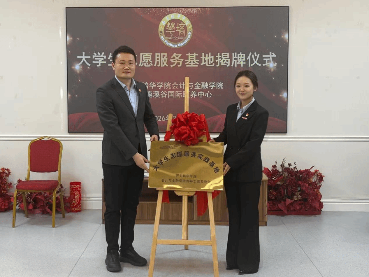 在热烈的氛围中,西安培华学院会计与金融学院大学生志愿服务基地正式揭牌。我院团委副书记王苗与白鹿溪谷国际颐养中心代表孙总共同为基地揭牌,标志着校地合作、志愿服务常态化机制正式建立。此次共建,是学院落实立德树人根本任务、拓展实践育人平台的重要举措,为青年学子搭建了服务社会、奉献爱心、增长才干的坚实平台,进一步推动志愿服务走向规范化、长效化、品牌化。