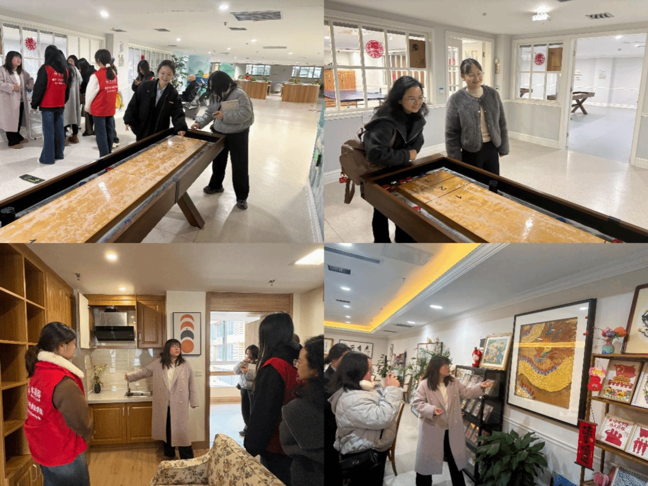 在工作人员的引导下,志愿者们有序参观了白鹿溪谷国际颐养中心的生活照料区、康复理疗室、文化活动厅等功能区域。参观过程中,老师们也积极参与到中心的趣味游戏活动中,现场氛围温馨又热闹。干净整洁的居住环境、专业贴心的照护设施、丰富多元的文娱场景,让大家直观感受到高端康养产业的人性化服务与现代化运营模式。