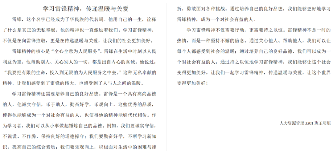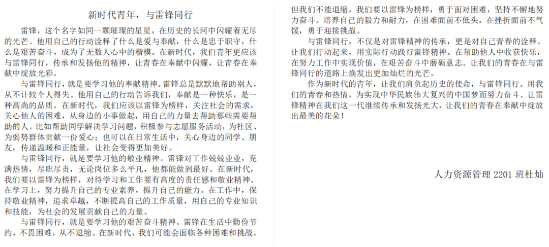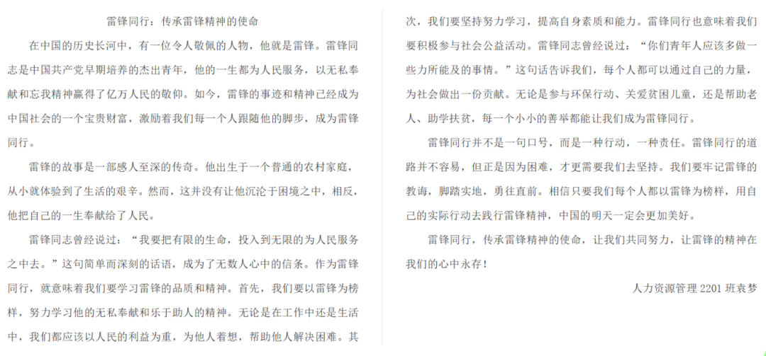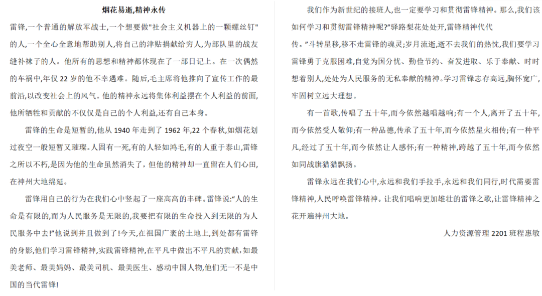 雷锋是时代的楷模,雷锋精神是永恒的。为进一步弘扬雷锋精神,深刻把握雷锋精神的时代内涵,推动新时代学雷锋活动不断拓展内容、创新形式、丰富载体,使雷锋精神深入每个人的心中,让更多的人了解并学习雷锋精神,激发青年的爱国情怀和社会责任感,共同谱写新时代的雷锋故事。为此,人力资源管理2201团支部积极响应学院团委的号召,组织开展以“学雷锋精神·树时代新风”为主题的征文活动。
