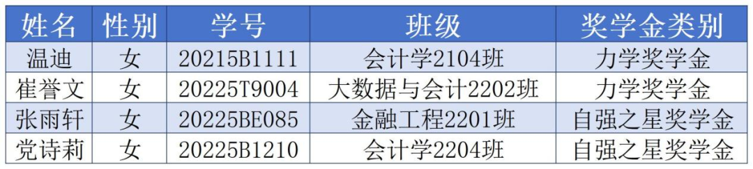 至此,关于评选西安培华学院2023-2024学年力学奖学金、自强之星奖学金会计与金融学院拟推荐校级联评工作已全部结束,共推选4名优秀的青年学子至校级参评。未来属于青年,希望寄予青年。望会金青年在奋斗中释放青春激情、在追逐青春中实现理想,在实干中磨砺本领才干,在奉献中绽放青春之花!