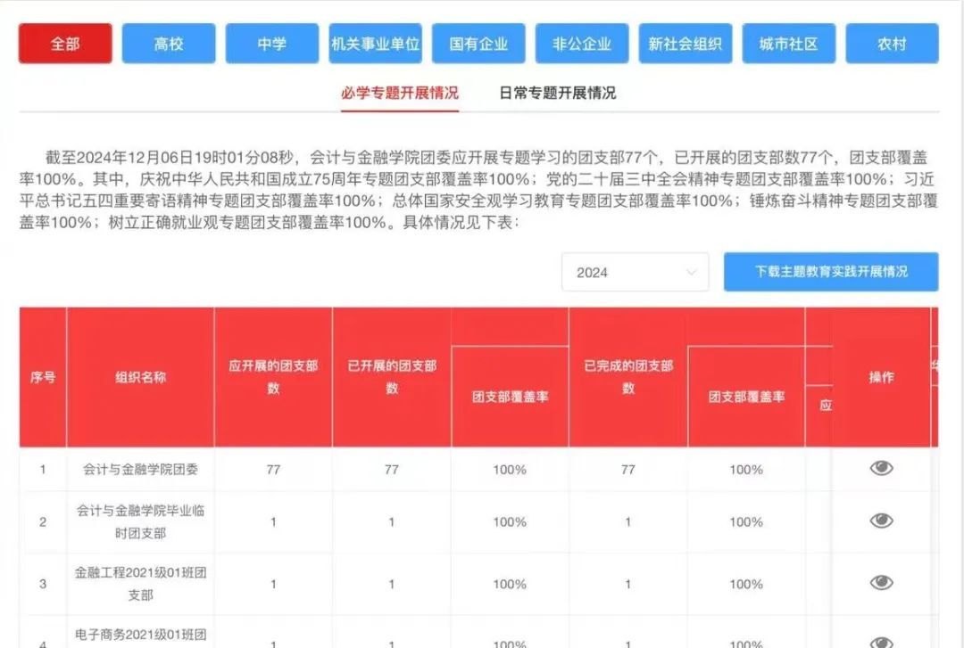 我院开展团员和青年主题教育专题教育6次,并要求在智慧团建进行录入,六项专题学习录入完成率达到100%。