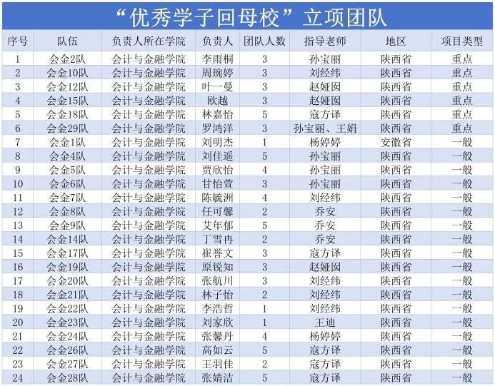会计与金融学院积极响应学校号召,大力倡导“优秀学子回母校”活动,累计报名人次61人,报名人次位于二级学院第一名。通过严格的评选及校级答辩,会计与金融学院成功立项校级24支团队,其中6支校级重点立项团队,18支校级一般立项团队,累计参加活动人次75人。