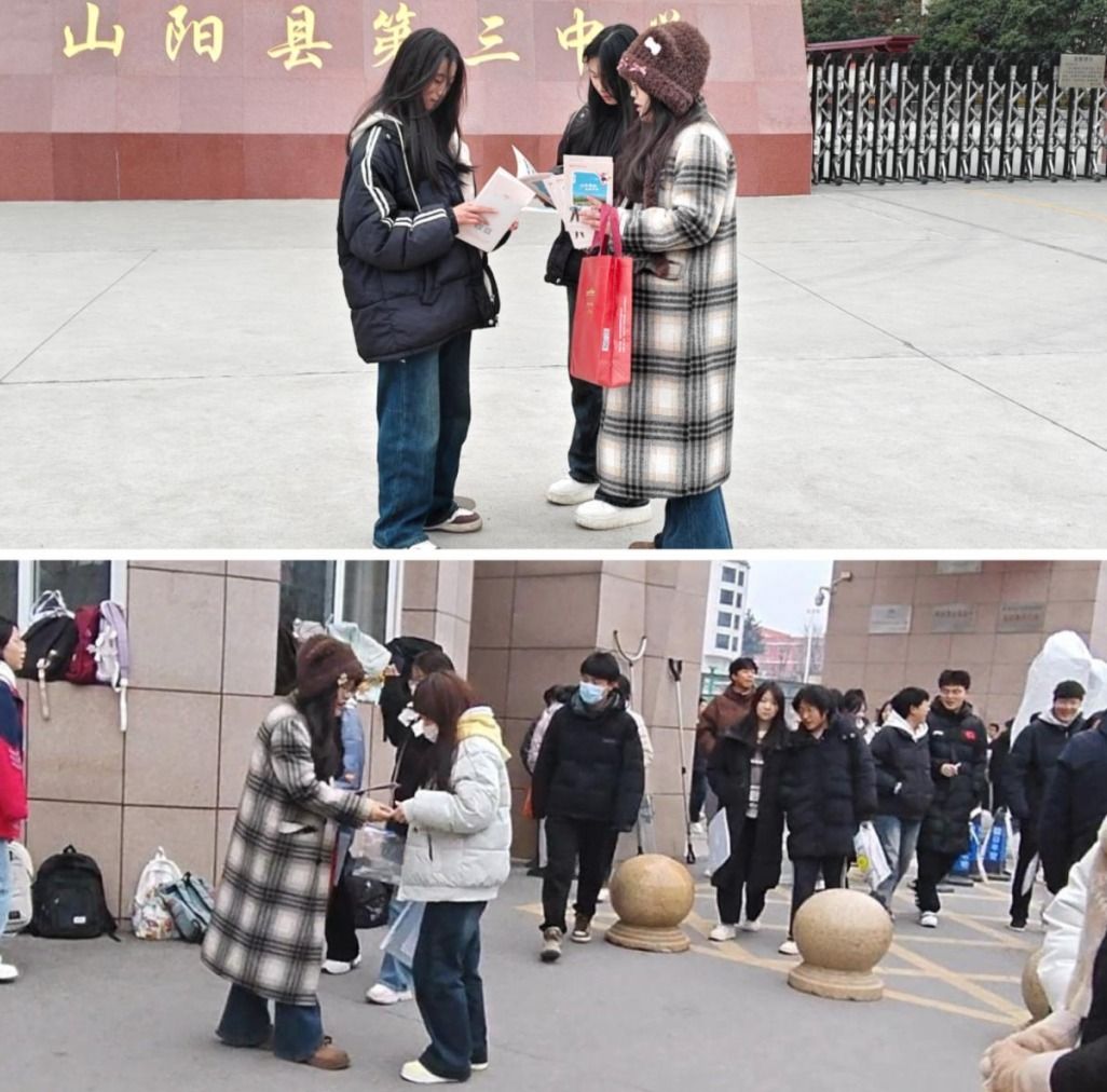西安培华学院会计与金融学院“从容应队”的队伍,带着对母校的眷恋与牵挂,回到了充满回忆的高中校园。在2025年1月4日,培华学子分别来到山阳县第三中学和陕西省山阳中学,恰好遇到高三学子正在参加八省联考。考试结束后他们上前为高三学子加油鼓气。