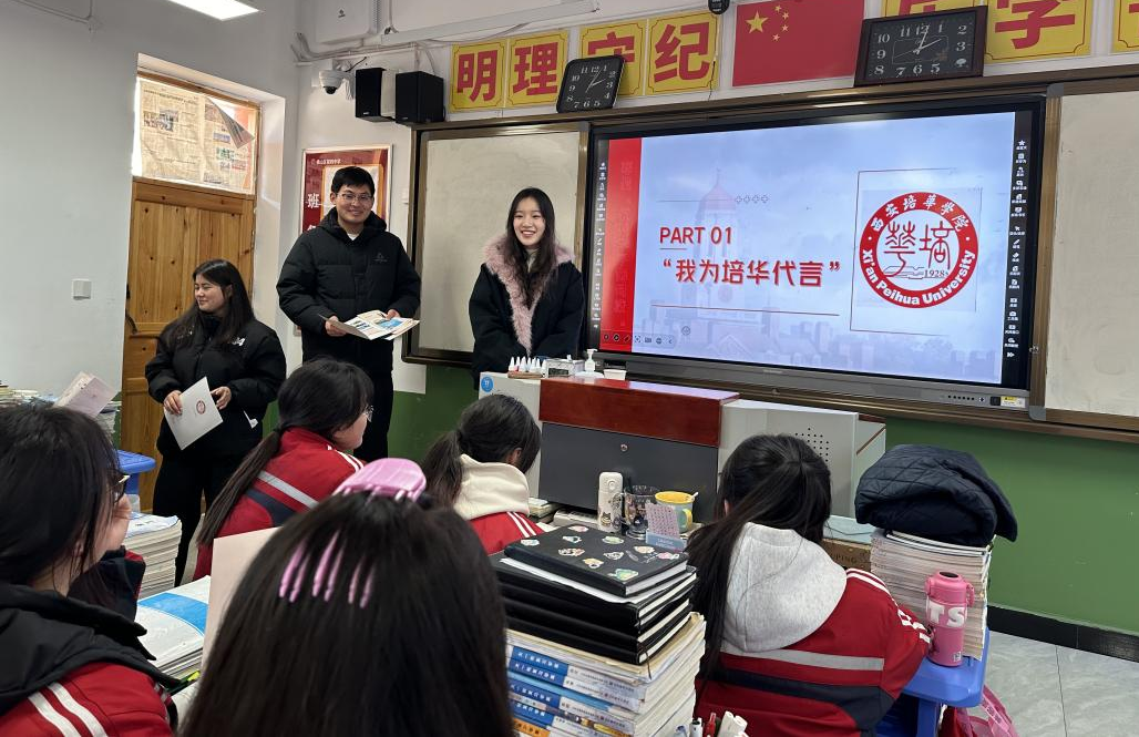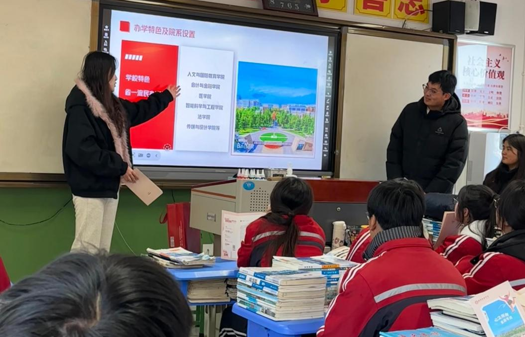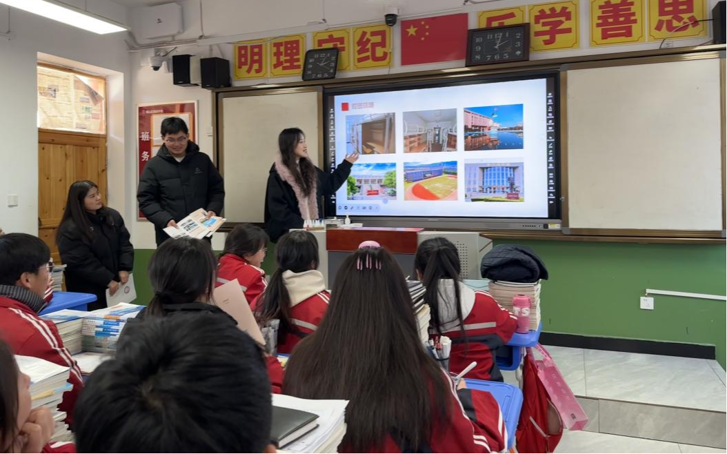 我队成员通过展示精心制作的PPT,将西安培华学院的校园风貌、特色建筑生动地呈现在高中学生眼前。紧接着,播放的生动视频进一步展示了丰富多彩的校园生活片段,让学生们仿佛身临其境。随后,我们结合自身的大学生活经历,从学习日常、社团趣事到个人成长蜕变,全方位地分享了大学的独特魅力。