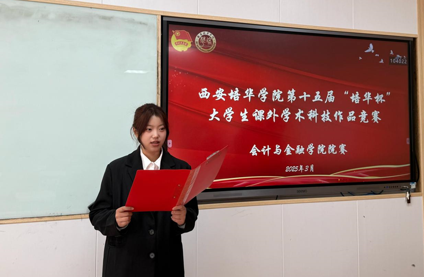 为深入贯彻党的二十届三中全会精神和习近平新时代中国特色社会主义思想,进一步引导会金学生努力培养科学精神和科学态度,积极学习科学知识和科学方法,踊跃投身创新驱动发展战略,推动大学生课外学术科技活动蓬勃发展,实现大学生创新成果有效转化,会计与金融学院于2025年3月18日在博远楼2201教室开展了第十五届“培华杯”大学生课外学术科技作品竞赛会计与金融学院院赛,助力学生展现创新风采。出席此次竞赛的评委有刘经纬老师、田晨老师、江凤香老师、王艳老师、张靖雯老师、同玉洁老师及赵娅囡老师。