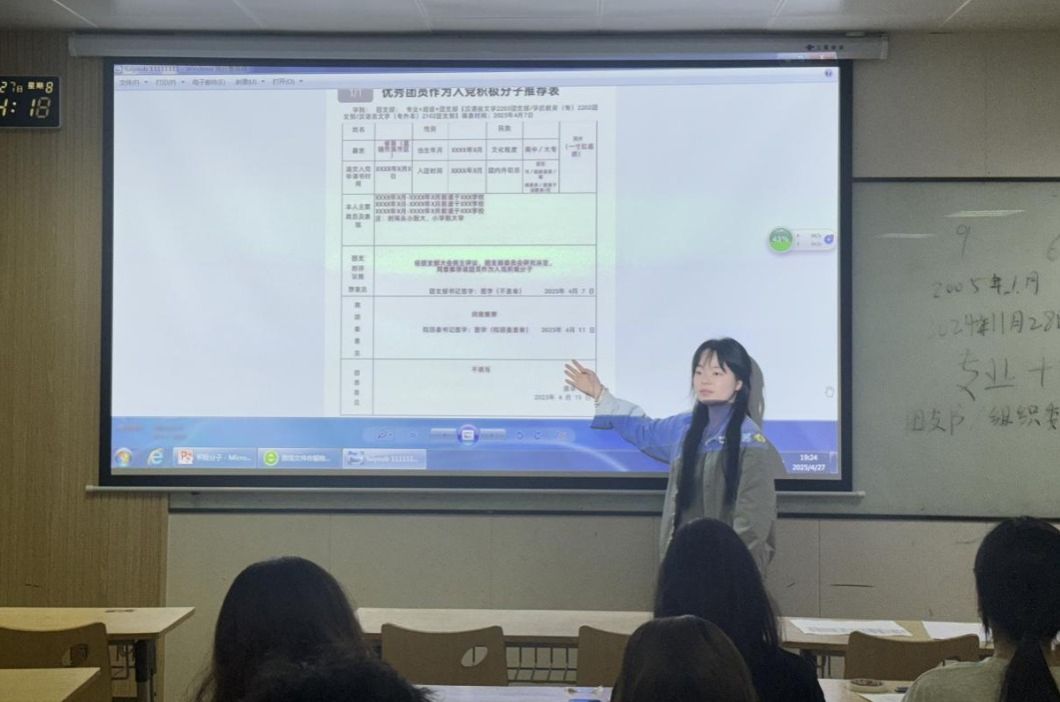 为贯彻高校团委关于加强共青团推优入党的工作精神,推动我院从严治团,增强团员意识,结合会计与金融学院的实际情况,我院团委于2025年4月27日在博远楼2616、2617、2618、2619教室组织第五十三期积极分子填写“入党积极分子推荐表”工作。本次活动由组织部负责人丁赛赛、李旭阳、李思彤、艾心雨主持。