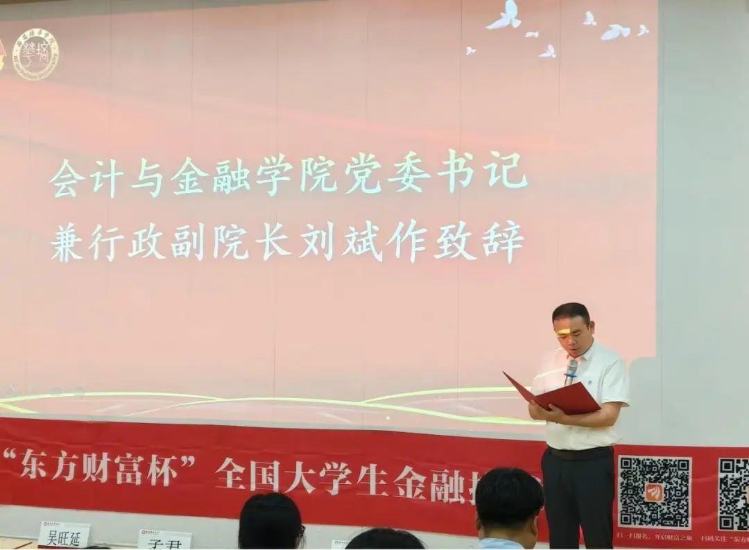 会计与金融学院党委书记兼行政副院长刘斌进行致辞,强调本次金融挑战赛对于学生成长与学院发展的重要意义,鼓励同学们积极参赛,在实践中锻炼专业能力,提升综合素质,将理论知识与实际操作紧密结合,为未来踏入金融行业奠定坚实基础,明确表示学院会全力支持此次比赛,希望同学们能在赛场上绽放光彩,为校争光,为青春添彩。