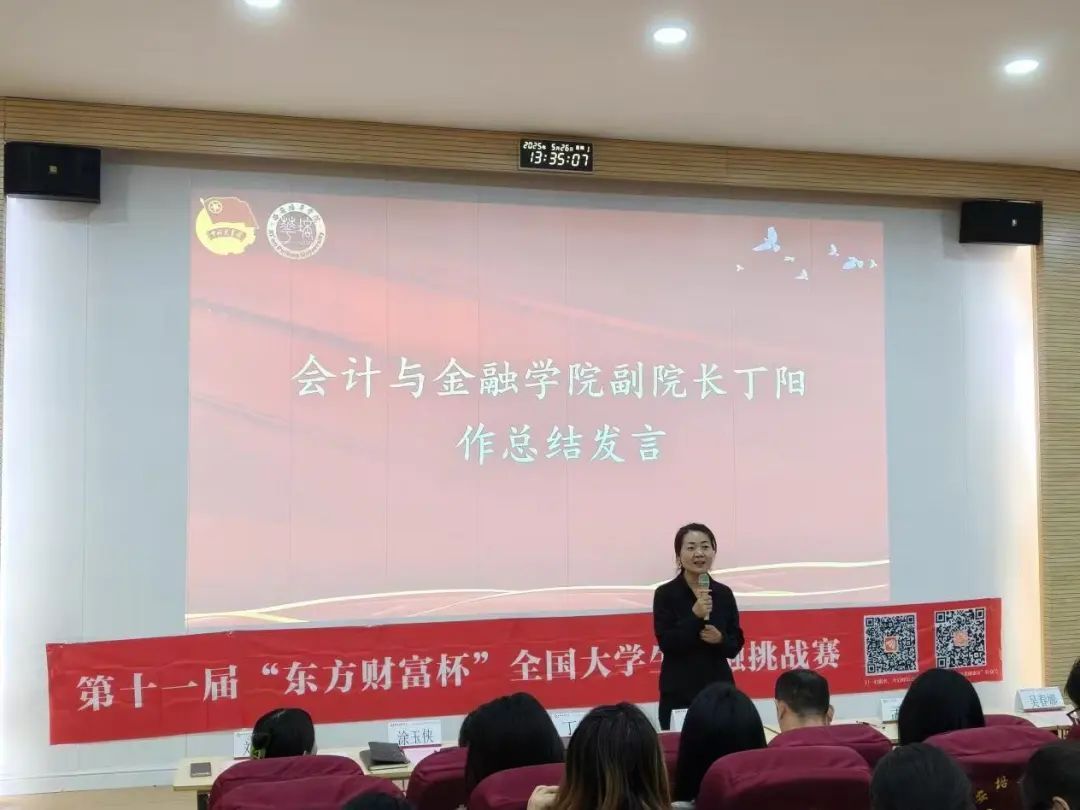 最后,会计与金融学院副院长丁阳进行总结发言,对嘉宾的到来表示感谢,对同学们的积极热情给予高度肯定,并再次强调金融挑战赛对于培养金融专业人才、提升学院教育教学水平的积极推动作用。鼓励同学们珍惜此次机会,全身心投入比赛,在金融浪潮中磨砺自我,以赛促学,努力在大赛中取得优异成绩,为自己的大学生活留下浓墨重彩的一笔。
