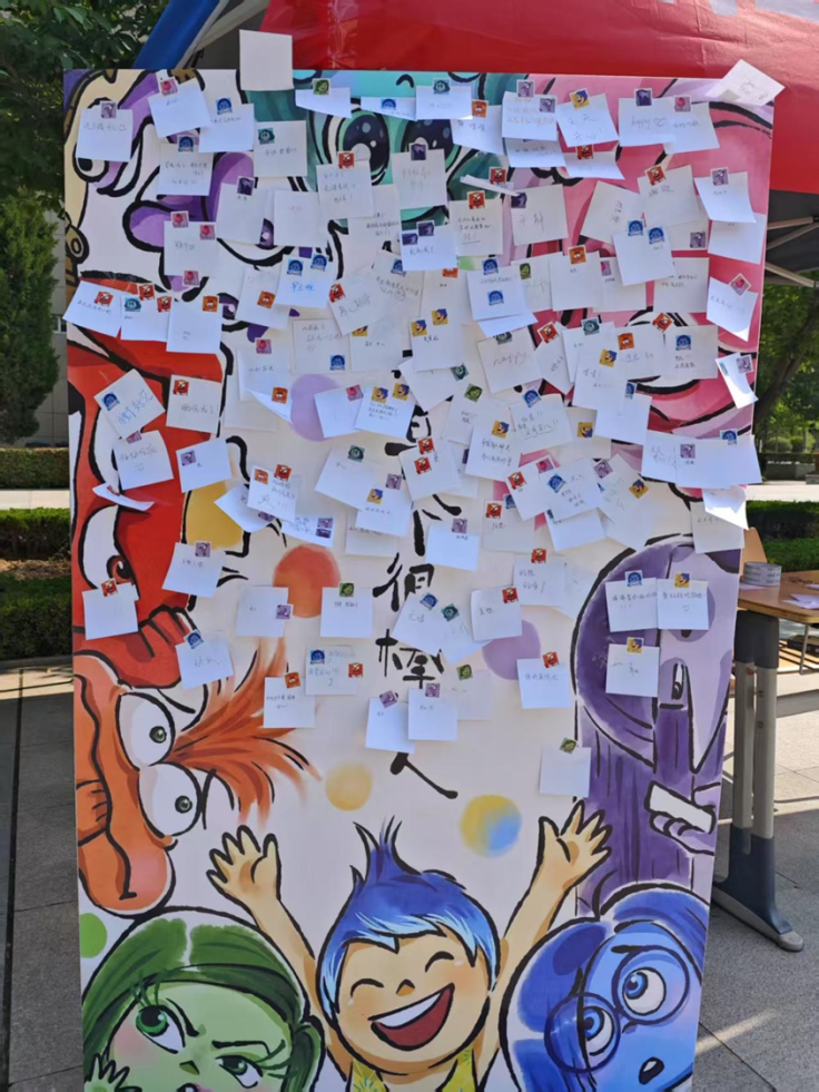 活动以热门动画《头脑特工队》中的九种情绪角色为灵感,精心设计了一系列互动环节。活动伊始,参与者挑选代表个人情绪的乐乐、忧忧、怕怕、厌厌、怒怒、焦焦、丧丧、慕慕、尴尬贴纸,确定自己的“心情主理人”。接着,他们将贴纸贴在便利贴上,作为独特的“心情封面”。在书写环节,学生们围绕情绪选择原因、触发事件及调节计划自由记录,在这个过程中深入剖析内心。最后,大家将写满心情的便利贴匿名张贴在情绪展板上,构成一幅充满故事的集体“心情图谱”。