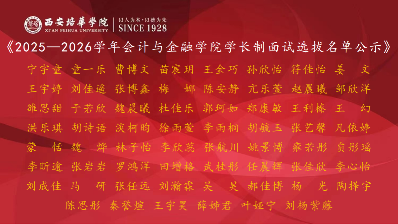 经过同学们激烈的角逐,本次共选拔出62名2025级班级学长,圆满达成预期目标。结合工作实际,现将会计与金融学院2025-2026学年学长选聘结果予以公示。