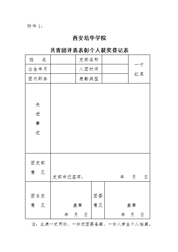 附件1:西安培华学院共青团评选表彰个人获奖登记表