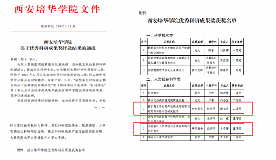 在科研获奖与成果应用方面,学院成效显著,成果质量与社会影响力持续提升。茹少峰教授、徐璋勇教授、罗新远教授共同撰写的决策咨询报告《“十五五”稳步增加我省农村居民收入水平的建议》被陕西省社科联《社科要报》2025年第41期采用,体现了研究成果服务省委省政府决策的咨政价值。罗新远教授、吴春娜教授完成的《灞桥区农村集体经济发展壮大方案》荣获陕西高等学校人文社会科学研究优秀成果二等奖。吴春娜教授、罗新远教授等撰写的调研报告《汉阴县国企带镇村模式促进乡村振兴的调研报告》在2025年陕西省经济学学会专题研讨会中获评优秀成果二等奖。此外,涂玉侠副教授的研究报告《基于高水平对外开放视角的陕西对外贸易风险评价研究报告》获得西安培华学院优秀科研成果奖二等奖。吴春娜教授主持完成的《汉阴县壮大集体经济及国企带镇村研究报告》获得西安培华学院优秀科研成果奖三等奖。这些成果的获奖与采纳,充分反映了学院在社会科学研究领域的学术水平、实践价值与政策影响力,展现了科研服务地方经济社会发展的重要贡献。
