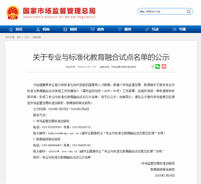 2026年1月29日, 市场监管总局标准创新司、教育部政策法规司联合发布《关于专业与标准化教育融合试点名单的公示》,我院主持申报的企业标准化管理微专业成功入选,是我院在专业与标准化教育融合、微专业建设方面的一次突破。