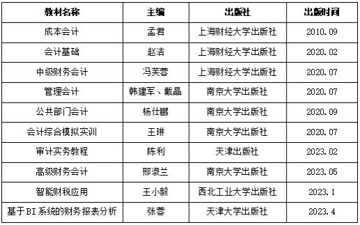 会计学专业自编教材8本,并出版多部专著,其中《成本会计》(主编:孟君)荣获陕西省2022年职业教育和高等教育优秀教材本科教育类二等奖。