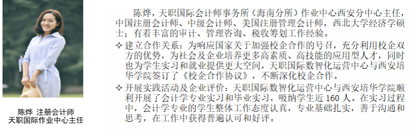 马慧慧,陕西华德诚会计师事务所担任审计助理期间,独立完成两家公司年审(审计底稿、现场盘存、账务审查、出具审计报告)。2021.11-至今于西安外事技工学校担任教务期间,完成排课、考试、计算课酬、评建等日常教学相关活动。