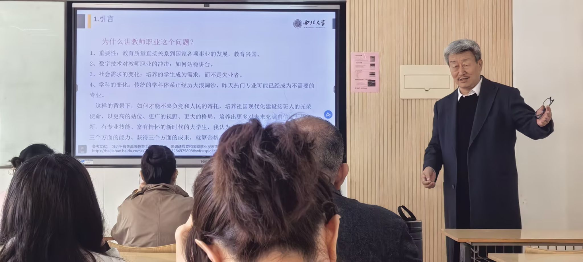 首先,李亚子主任向大家隆重介绍茹少峰教授的研究领域与学术成就:曾任西北大学经济管理学院教授、博士生导师;西北大学第八届学术委员会委员,教育部人文社会科学重点研究基地—西北大学中国西部经济发展研究中心特聘研究员,国家社科基金项目、教育部基金项目评审专家,第十一届陕西省教学名师。茹教授长期深耕高校教育教学与研究领域,拥有丰富的育人经验,希望大家能珍惜这次专题讲座机会,向茹教授学习,以新时代合格教师的核心素养为目标,确定自己的职业发展方向。