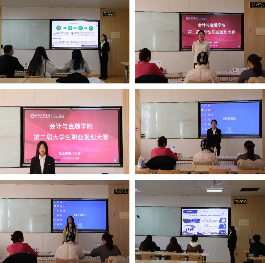 2024年11月25日14:30 - 18:00,西安培华学院会计与金融学院“第二届全国大学生职业规划大赛”院赛初赛在2301教室、2304教室(就业赛道)以及2306教室、2307教室(成长赛道)顺利举行,来自两个赛道80名选手经过激烈角逐,各有20人脱颖而出,成功晋级复赛,向着职业规划的更高舞台稳步迈进。