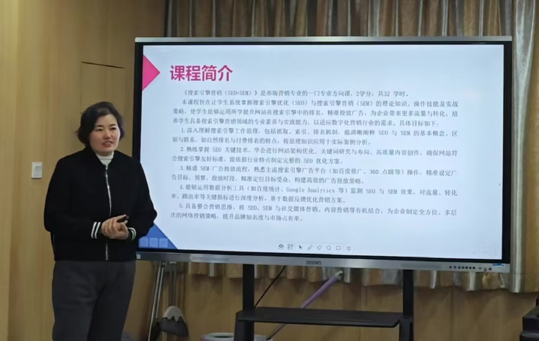 宋天妹老师介绍了《搜索引擎营销》课程基本情况与教学要求,明确SEO项目分析在课程中的位置,具体讲解SEO项目分析所涉及的市场定位、竞争对手、关键词、客户需求分析四方面的内容。