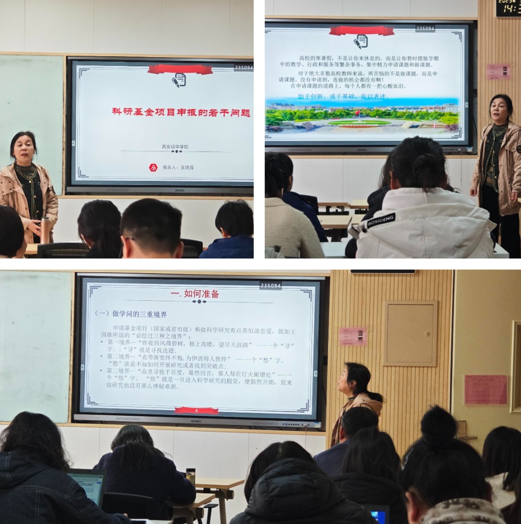分享会上,吴艳霞教授结合自身丰富的科研项目申报经验,围绕科研基金项目的准备、选题、研究内容撰写、创新点提炼及申报成功率提升等关键问题展开深入讲解。她强调,选题应立足学科前沿,紧密结合国家战略需求,同时注重研究的可行性和创新性;在撰写研究内容时,需逻辑清晰、重点突出,充分体现研究的学术价值和应用意义;此外,她还分享了如何精准提炼创新点、优化申报书撰写技巧等实用策略,为与会教师提供了宝贵的指导意见。