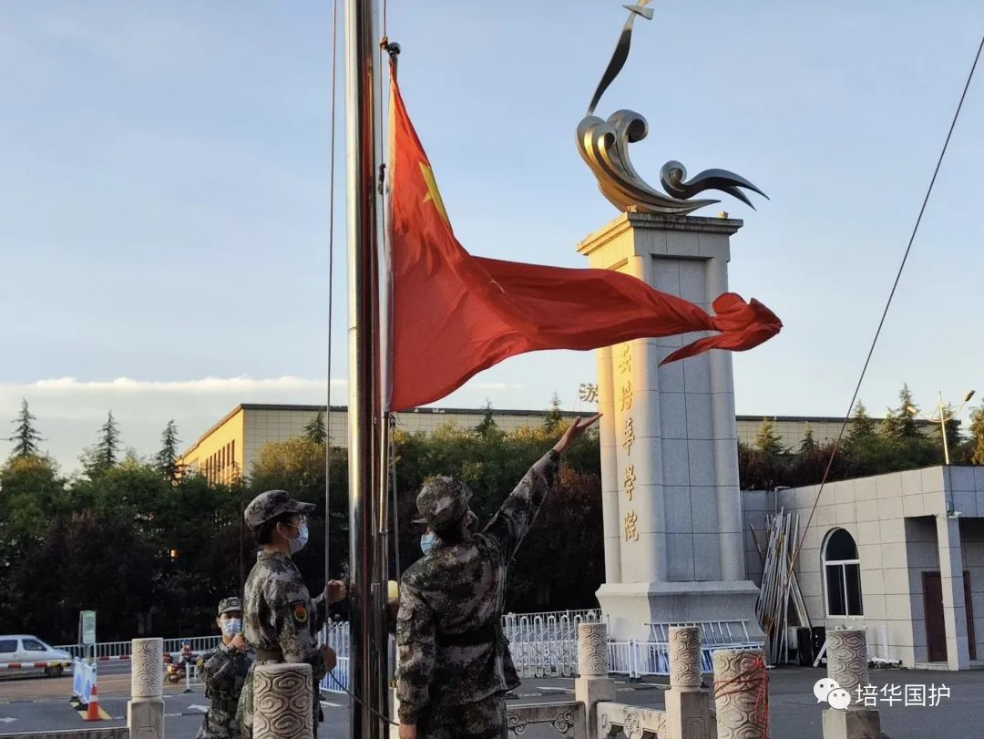 2022年10月14日,国旗护卫队的成员相聚在南门,举行降旗仪式。“正步—走”的口令声划破了南门的宁静,冷风吹过发丝,穿过绶带,落在金灿灿的勋章上,眼中的信仰更加坚定,她们昂首挺立,以高昂的气势,铿锵的步伐入场,国护队员们以“线上降旗”这种特殊的方式在屏幕前守护着国旗,鲜艳的五星红旗缓缓下降,旗手动作娴熟地绑好旗花,降旗仪式由此落下帷幕。我们以最高的敬意守护国旗,不论是升旗,还是降旗,都表达了我们的爱国之情。吾辈青年当自强,心怀砥砺报国之志,用自己的实际行动,告白祖国,护卫国旗的荣光!