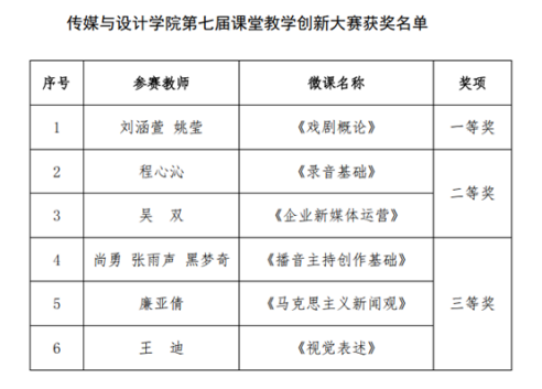 本次教学创新大赛的成功举行,为各专业教师提供了一个展示才华和交流学习的平台,激发了他们在教学创新方面的热情和动力,也进一步推动了学院教学创新实践的发展,希望在接下来的校赛中,学院能够取得更为优异的成绩。