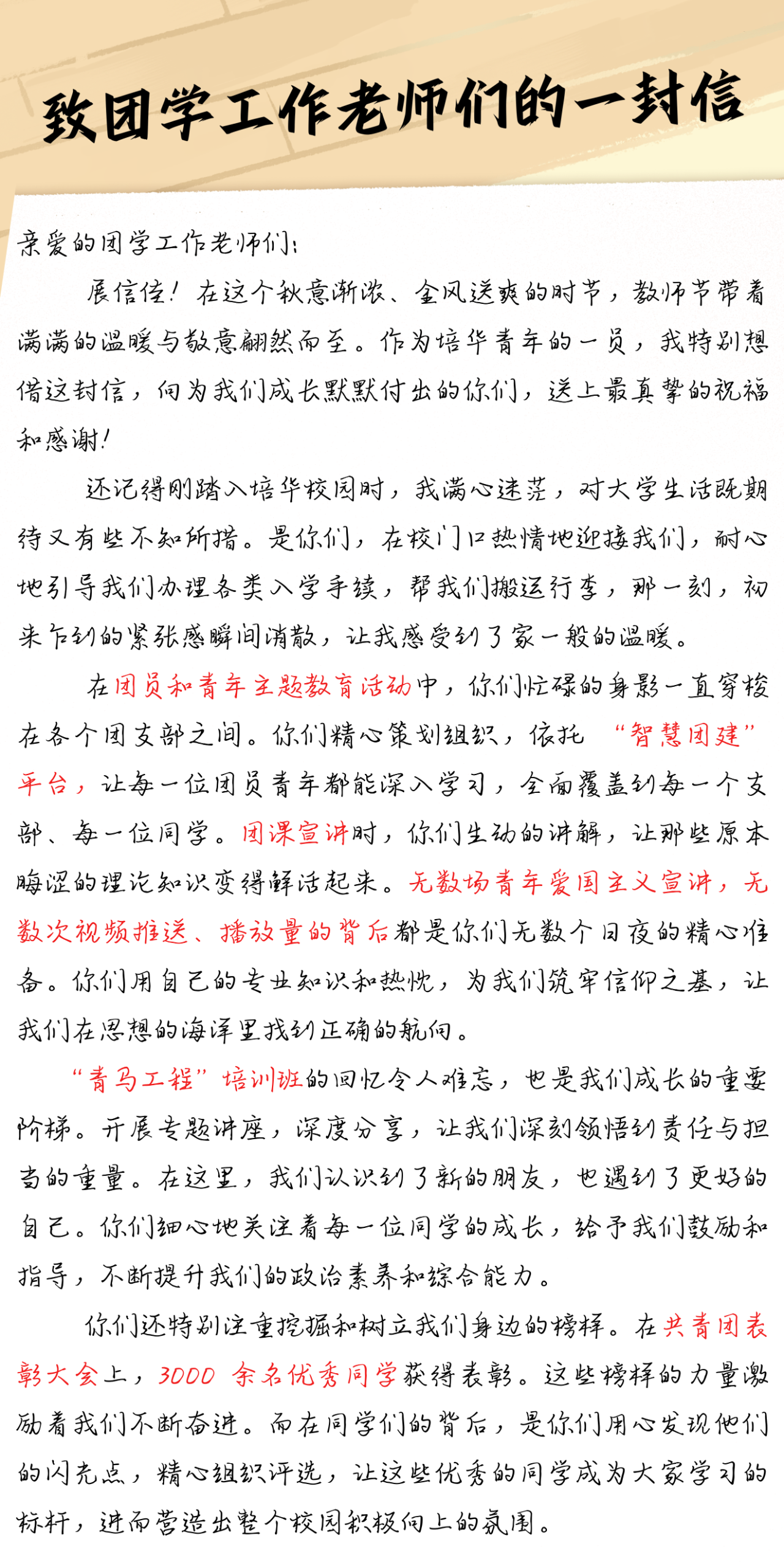 (3)围绕开学第一课、教师节、9.18纪念、亚足联U23亚洲杯预选赛志愿服务等关键节点,通过“培华青年”微信公众号、校团委官网等平台发布专题推文百余篇,向陕西日报、团省委新媒体平台报送通讯稿件3篇,其中《培华青年志愿者护航U23亚洲杯预选赛》获省级平台转载,扩大学校团工作影响力。