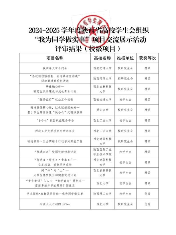 校学生会 “共话校园・校长接待日” 项目获评陕西省高校学生会组织 “我为同学做实事” 青苗示范项目。