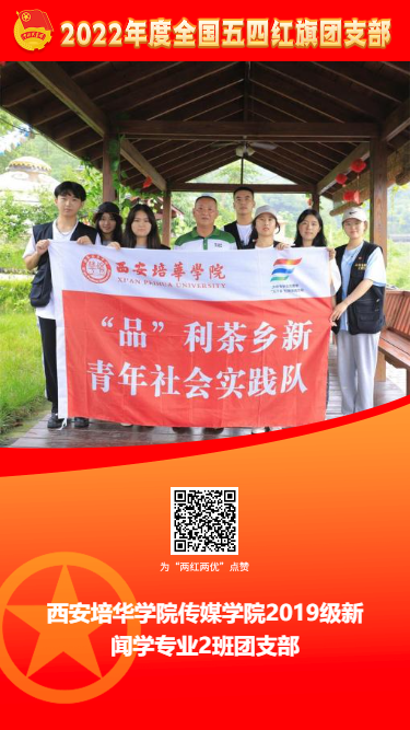 西安培华学院传媒学院新闻学1902团支部共有团员32人(含中共党员7人,预备党员5人),青年2人。自支部成立以来,团员青年积极落实“三会两制一课”,以“思想建设、组织建设、文化建设、学风建设、第二课堂阵地建设和特色专项建设”六个维度,全面提升基层团支部活力。支部青年连续3年组建“情系平利”三下乡社会实践队获评2022年“陕西省三下乡社会实践优秀团队”,同时依托“姜维之班”创建积极提升基层团支部活力,先后获评2021年“陕西省五四红旗团支部”、入围2022年“陕西省活力团支部”展示序列、连续三年获得“先进班集体”和“五四红旗团支部”等多项荣誉。挺膺担当、奋力奔跑,积极开展学风建设,同时充分提升个人素养,班级团支部平均学习成绩位列同专业班级第1名,先后有获评“国家奖学金” “国家励志奖学金”6人次、获评“全国大学生自强之星”1人次,“陕西省大学生自强之星标兵”1人次,获评省级以上学科竞赛30余人次,获评校级“优秀共青团员”等荣誉40余人次。