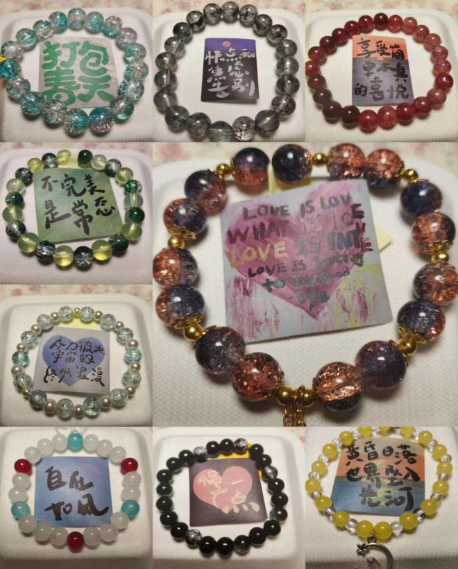 有手工制作的发圈、卡砖、毛绒娃娃、手作卡套等