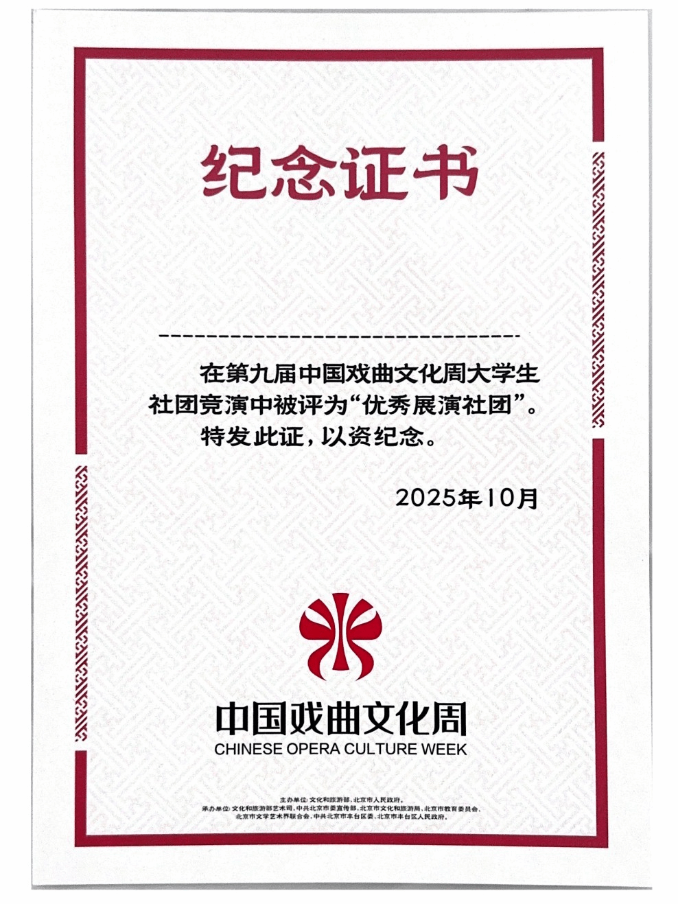 2025年9月30日至10月3日,由中华人民共和国文化旅游部和北京市政府主办的第九届中国戏曲文化周大学生社团竞演活动在北京园博园明天剧场盛大开启,西安培华学院梨园戏曲社受邀参加此次竞演。竞演吸引了全国40所高校的23支戏曲社团参与,参赛剧种涵盖京剧、越剧、秦腔、粤剧等。梨园戏曲社社团社长王佳音同学演唱的越剧《西厢记.琴心》选段在此次竞演中脱颖而出,王佳音的演出不仅赢得了现场的满堂喝彩,也为梨园戏曲社赢得了“优秀社团” 称号。梨园戏曲社在此次竞演活动中的精彩表现充分展现了传统戏曲的魅力,也为学校赢得了荣誉。