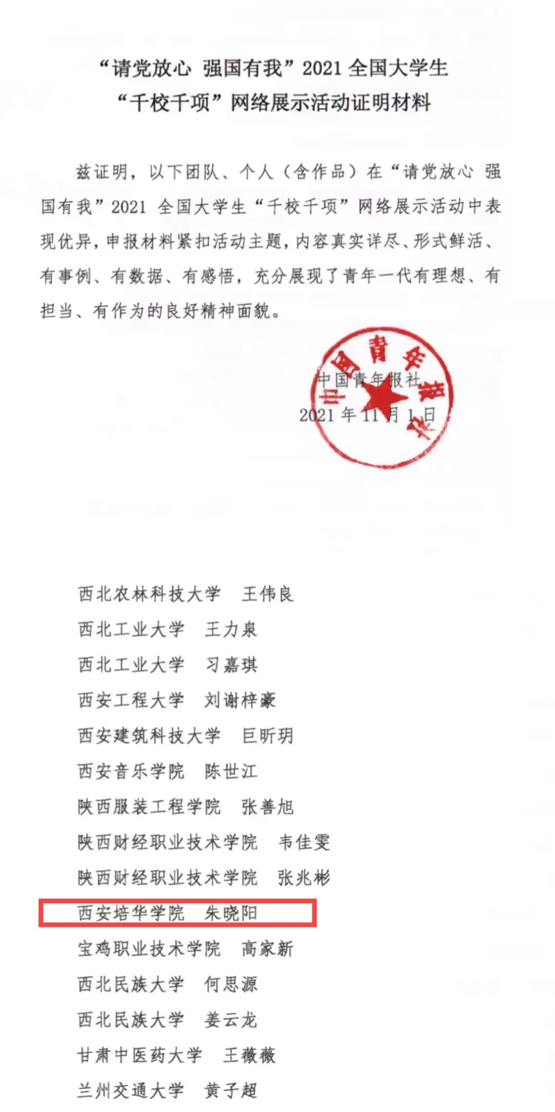 为大力宣传、充分展示2021年全国大中专学生志愿者暑期“三下乡”社会实践活动成果,团中央青年发展部、中国青年报、中国青年网共同举办2021年全国大中专学生志愿者暑期“三下乡”社会实践“镜头中的三下乡”成果遴选和“千校千项”成果遴选活动。两项活动经前期报名审核、作品发布、网络展示、综合评审等环节,我校纷纷取得佳绩。其中,西安培华学院团委荣获2021年“镜头中的三下乡”优秀组织单位荣誉称号,我校筑梦成长实践队荣获“镜头中的三下乡”优秀报道团队荣誉称号,筑梦爱农小分队荣获“镜头下的三下乡”优秀视频团队荣誉称号,医学院青歌志愿服务队朱晓阳同学荣获“千校千项”社会实践先进个人荣誉称号。