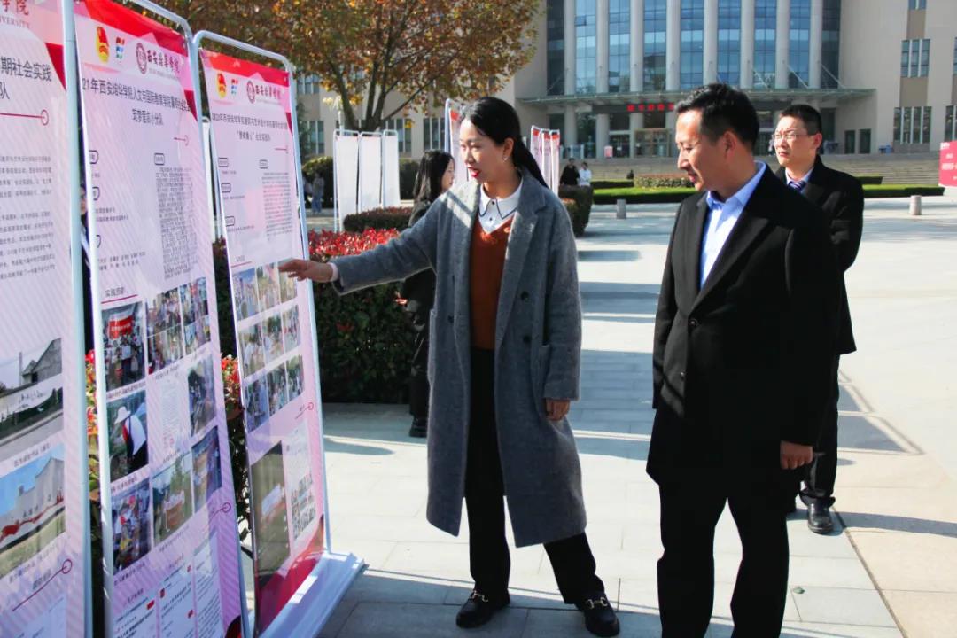 近期,西安培华学院三下乡社会实践成果展也在我校综合楼西广场隆重举办。西安培华学院理事长姜波博士,校长李映方教授,党委书记罗新远教授,副校长、党委副书记姚文静副教授,党委工作部部长陈玲老师,校长办公室主任李健老师,教务管理中心主任铁卫老师,党委宣传部部长柳雨老师,医学院常务副院长扈国栋教授,人文与国际教育学院常务副院长梁蕊副教授,教学副院长赵洁副教授等莅临现场参观三下乡成果展。同时,各二级学院党委(党总支)书记、副书记,各学院辅导员老师和同学们均到场参观,并在留言簿上提笔寄语青年。
