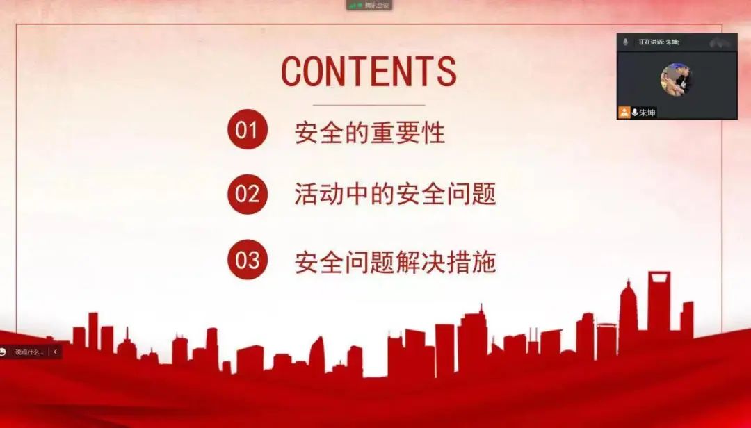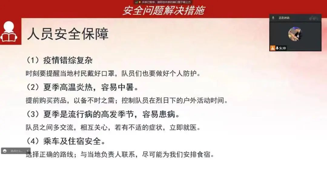 8月6日晚,团队进行线上安全培训,团队安全负责人主要从“安全的重要性”“活动中的安全问题”, “安全问题解决措施”三个方面开展培训,着重提到了食品安全和人员安全。