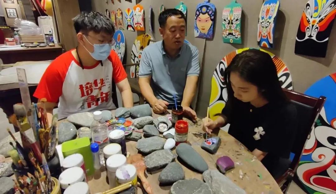 图为智小信调研团成员在非遗传承人的指导下绘画脸谱