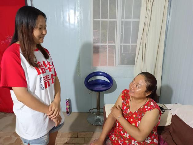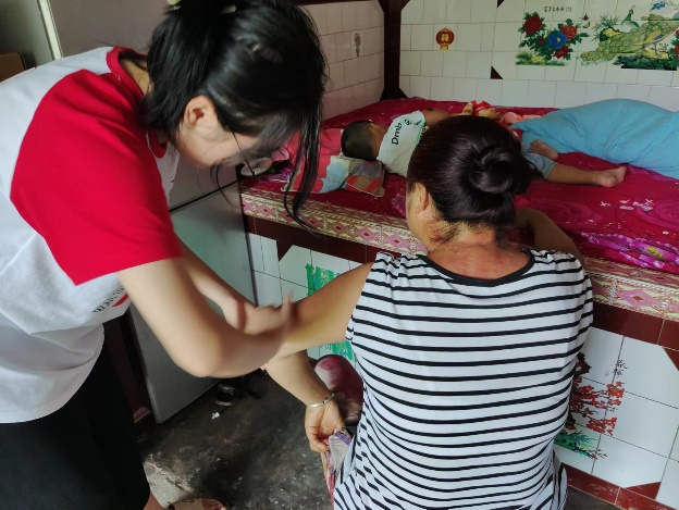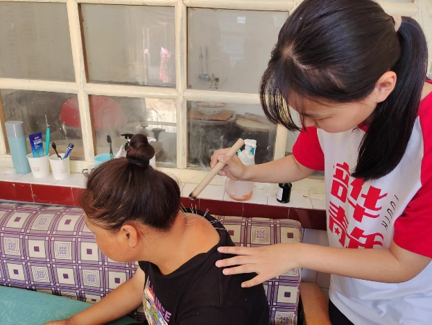 图为成员为村民刮痧缓解肌肉疼痛