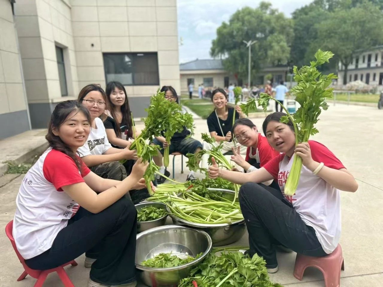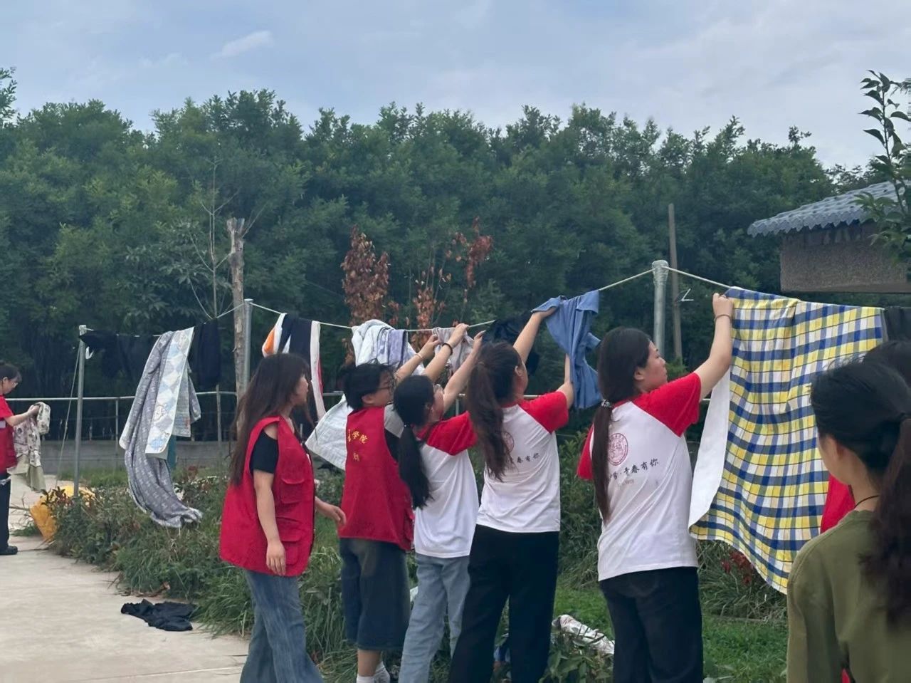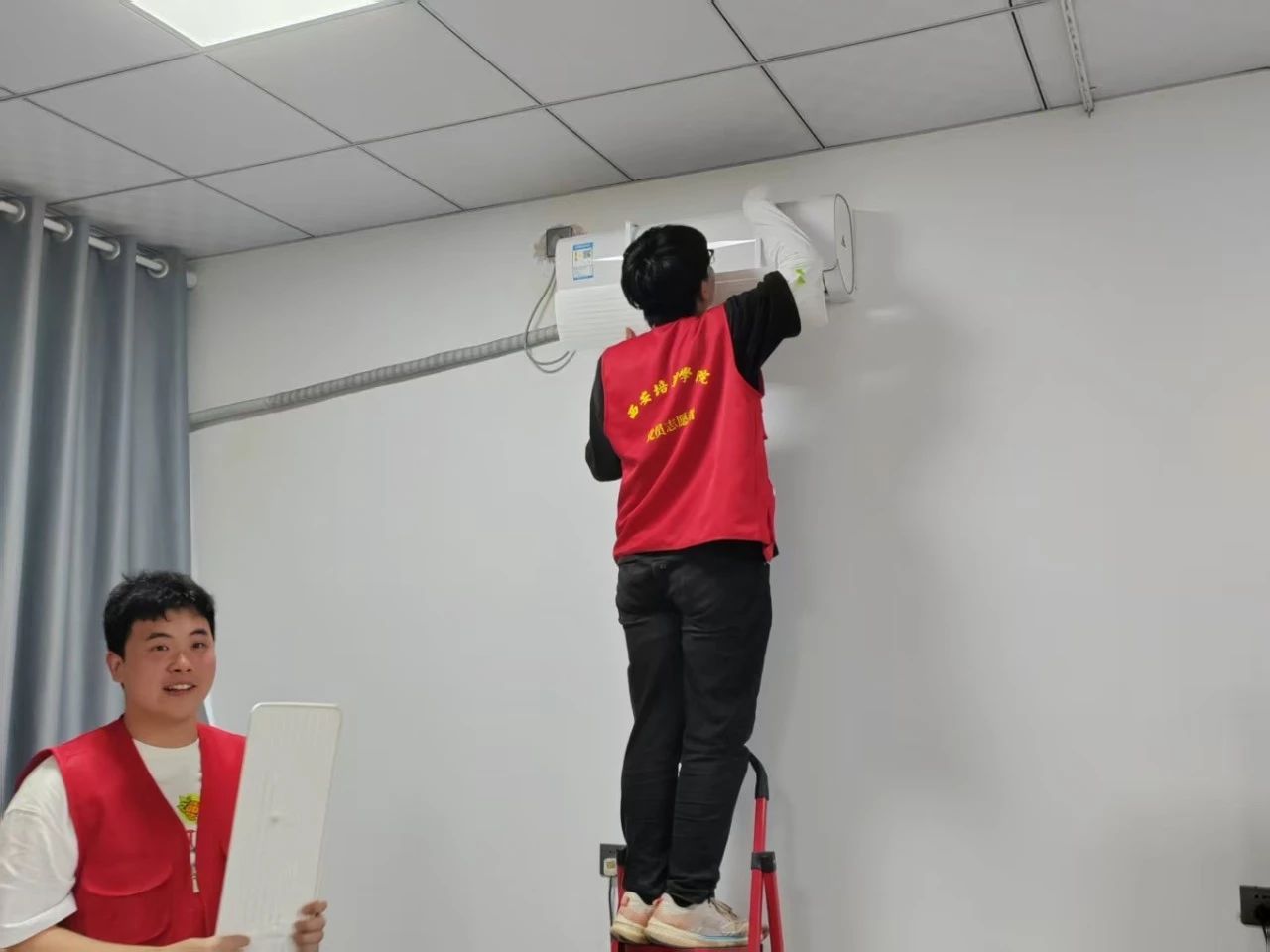 除了精神陪伴,志愿者们更聚焦老人的实际需求,主动分担日常琐事:看到晒衣区的衣物没人收,大家便分工整理、晾晒,将衣物叠放整齐送到老人房间;得知养老院新购的空调需要安装,年轻力壮的志愿者立刻搭手,搬运设备、传递工具,配合工作人员高效完成安装,为炎炎夏日里的老人提前备好清凉;厨房内,志愿者们则围在菜篮旁,熟练地摘菜、洗菜,为养老院的餐食准备出一份力,忙碌的身影成了厨房里一道青春风景线。
