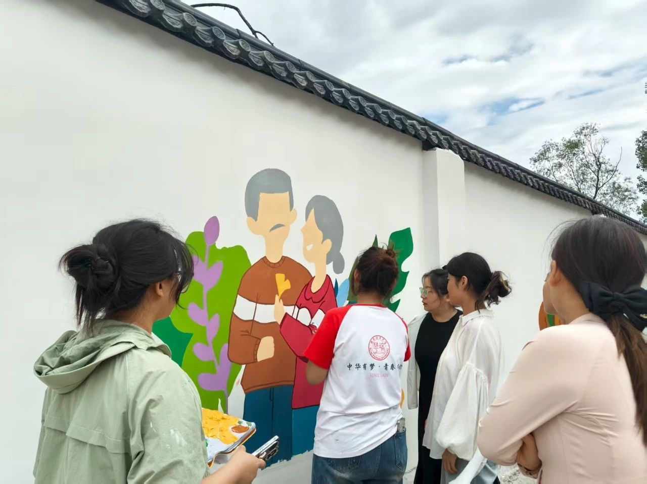 “爷爷,您年轻时候是做什么工作的呀?”“奶奶,这天气变化快,您可得注意添衣。”墙绘间隙,志愿者们主动围在老人身边,拉起了家常。老人们打开话匣子,分享着过去的生活经历、人生感悟,志愿者们静静倾听,时而点头回应,时而轻声询问,用耐心与尊重驱散老人们的孤独感。85岁的张奶奶握住志愿者的手说:“孩子们一来,院里就热闹了,有人说话就是好。”老人们经常在树荫下观看志愿者们忙碌的身影,老人们不知不觉已经静静围在画前,仔细观看轻轻抚摸墙面,脸上挂着欣慰的笑容。