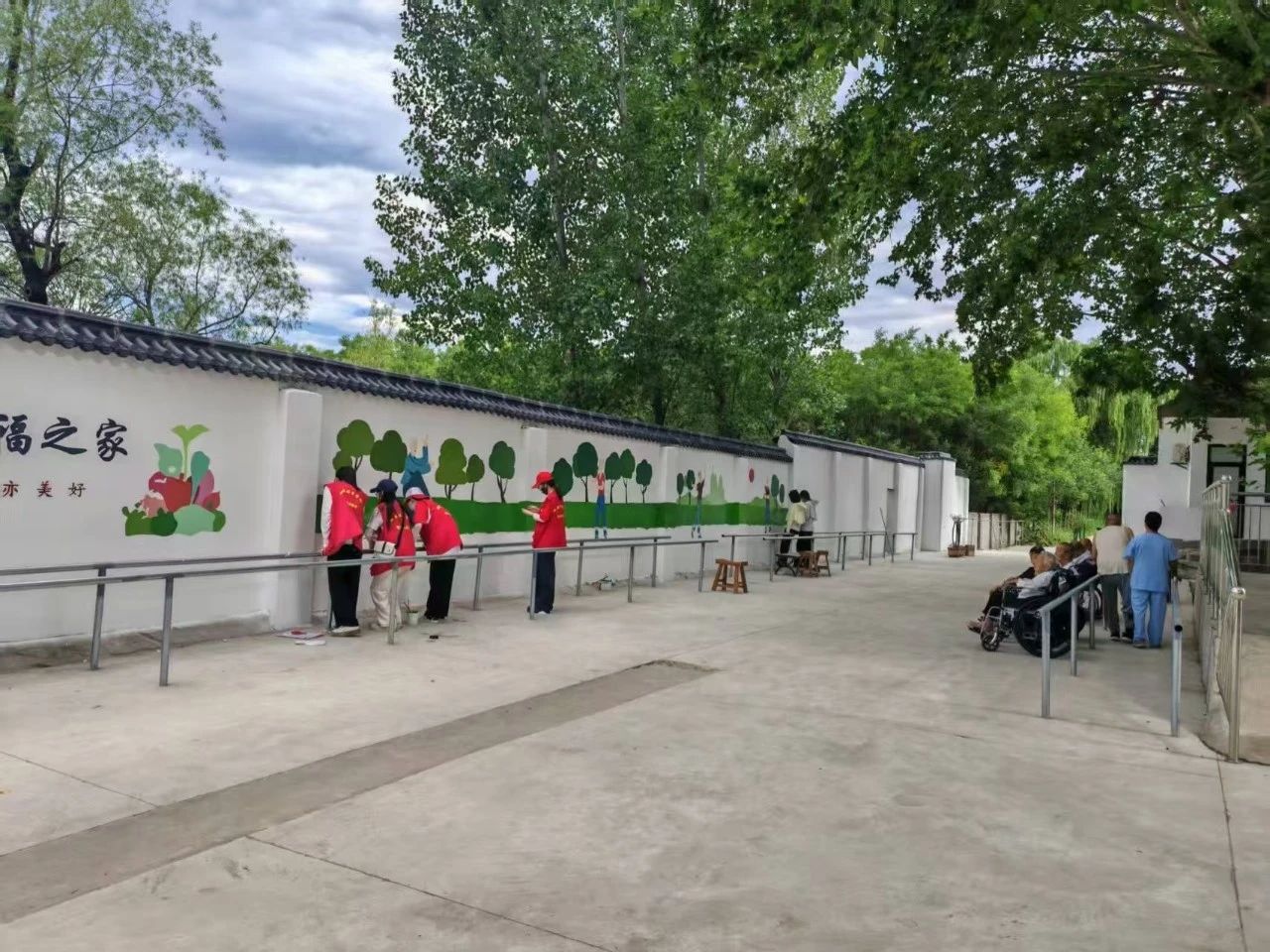 活动中,墙绘美化成为最亮眼的一笔。志愿者们提前调研老人的审美偏好,确定了“关爱老人”“百善孝为先”等主题,以柔和的色调、生动的图案为养老院的走廊、活动区墙面“梳妆打扮”。山水相依的景致、栩栩如生的花鸟、饱含祝福的短句……原本单调的墙面在志愿者的巧手下变得灵动鲜活。一位老人坐在轮椅上驻足观看,笑着说:“这墙一画,感觉院里亮堂多了,看着心里就舒坦!”