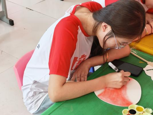 活动初始,王老师以简单易懂的方式,向孩子们介绍了宣纸的种类与特色,绘画的基本技巧,如何调色、如何运笔、如何在扇面上构图。志愿者们则一对一地陪伴在孩子们身边,鼓励他们大胆尝试,勇敢表达。活动刚开始的时候,有些孩子因为陌生或紧张,迟迟不敢下笔。但在志愿者的耐心引导和鼓励下,他们逐渐放松了心情,开始尝试着在扇面上留下自己的第一笔色彩。