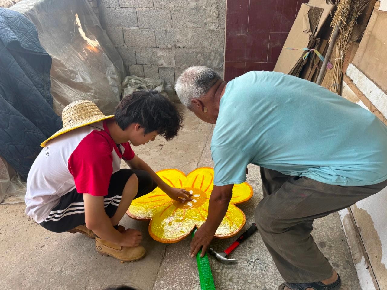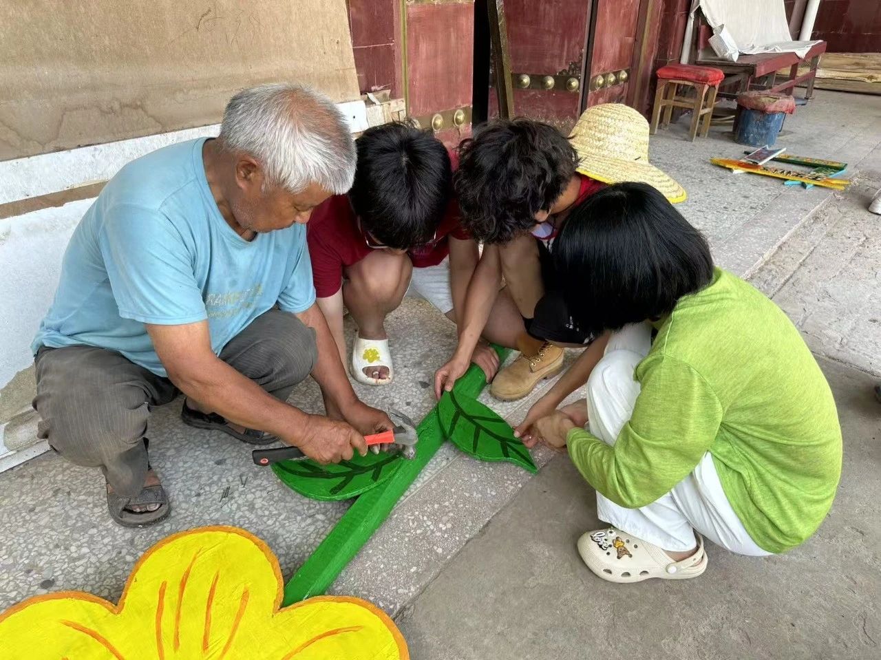 “这木头,就像人生一样,有顺的时候,也有弯的时候。做木匠,就是要把这些不顺的地方,一点点打磨平整。我这一辈子,经历了风风雨雨,可只要一拿起工具,心里就踏实”。只见他手持锯子,在木板上娴熟地推拉,木屑如雪花般纷纷落下,不一会儿,一块粗糙的木板就变得光滑平整。随后,他又拿起凿子,在木板上精准地凿刻,线条流畅,力道恰到好处。实践队员们看得目瞪口呆,纷纷为老木匠的精湛技艺点赞,并表示想要学些爷爷的传统手艺。老木匠见状,欣慰地笑了,开始手把手地教队员们一些基础的木工技巧。队员们学得格外认真,虽然一开始笨手笨脚,经常出错,但在老木匠的耐心指导下,渐渐找到了灵感。当看到自己亲手制作出的一个小小的花木板,大家都兴奋不已。