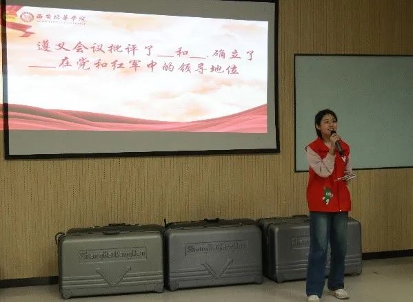 活动伊始,宣讲团志愿者王星语首先向大家详细介绍了遵义会议的背景、召开过程及其重要历史意义。紧接着,王星语通过丰富的史料和生动的故事,深入剖析了遵义会议中党的领导和红军所展现出的坚定信念、民主团结和艰苦奋斗精神。
