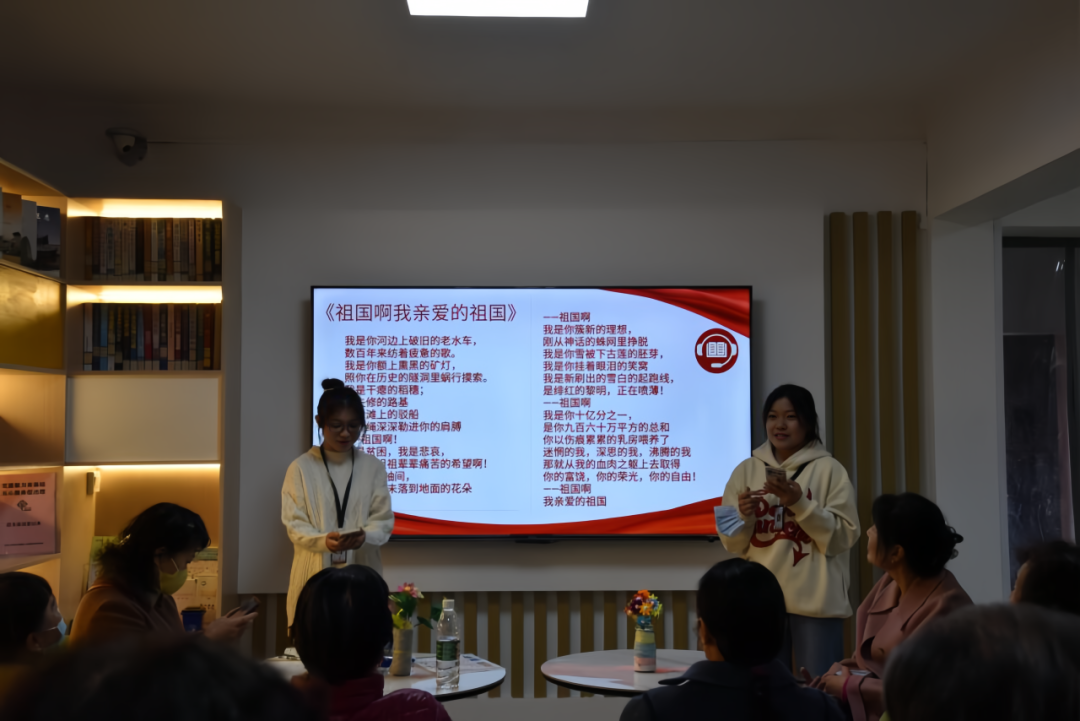 随后,两位领诵的同学站在台前,其他同学站在其后,伴随着“祖国啊祖国,你永远朝气蓬勃”,真挚动人的文字经过深情的诵读,引起众多居民的共鸣与感悟,在这喜迎新春的欢快氛围下,居民们情绪高涨,掌声也变得格外响亮。紧接着,两位领诵的同学在台上教居民们如何有感情的去朗读,其他同学坐在居民身边进行辅导,一起用声音的力量传递喜悦与友善,现场气氛活跃,空气里氤氲着诗意和温暖。最后,居民们齐声朗诵了这首诗歌,宣告本次活动圆满结束。