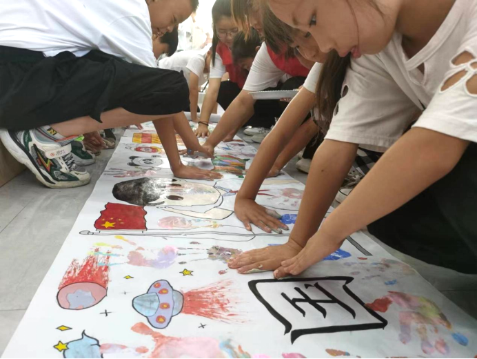 我们开设专门的爱国主义教育课和党史课,让孩子们更好的了解党史。将爱国主义教育融入到绘画课中,每一位孩子都用画笔表达心中对祖国的热爱之情,师生共同合作创作了一幅爱国长卷《厉害了我的国》,在最后的“喜迎二十大,童心向未来”主题文艺演出中,老师和学生一起表演了《名字叫中国》和《国家》的手势舞,在这十天的课程活动里,志愿者老师从各方面融入爱国主义教育,培养小朋友的爱国主义情怀。